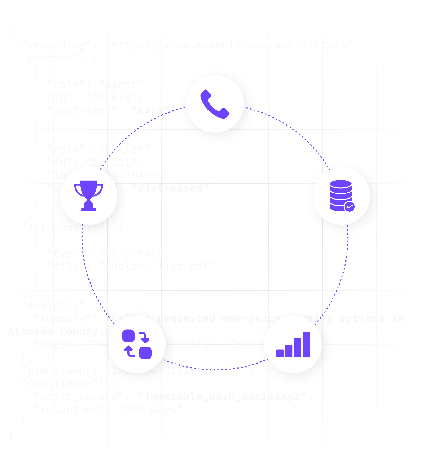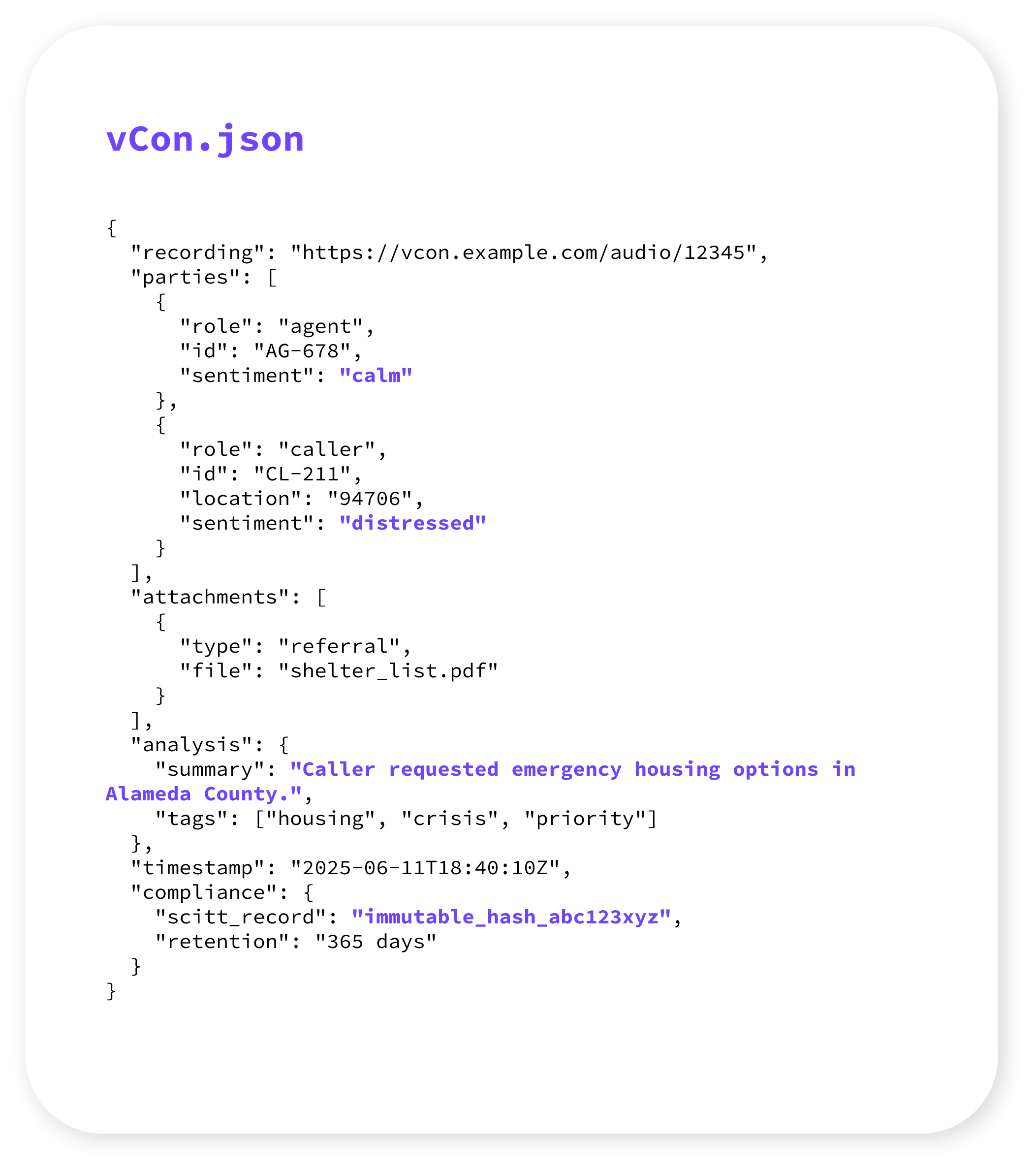 Built in JSON format, vCons are portable, secure, and ready to plug into your existing tools. They’re not just records, they’re rocket fuel for better service and smarter decisions.